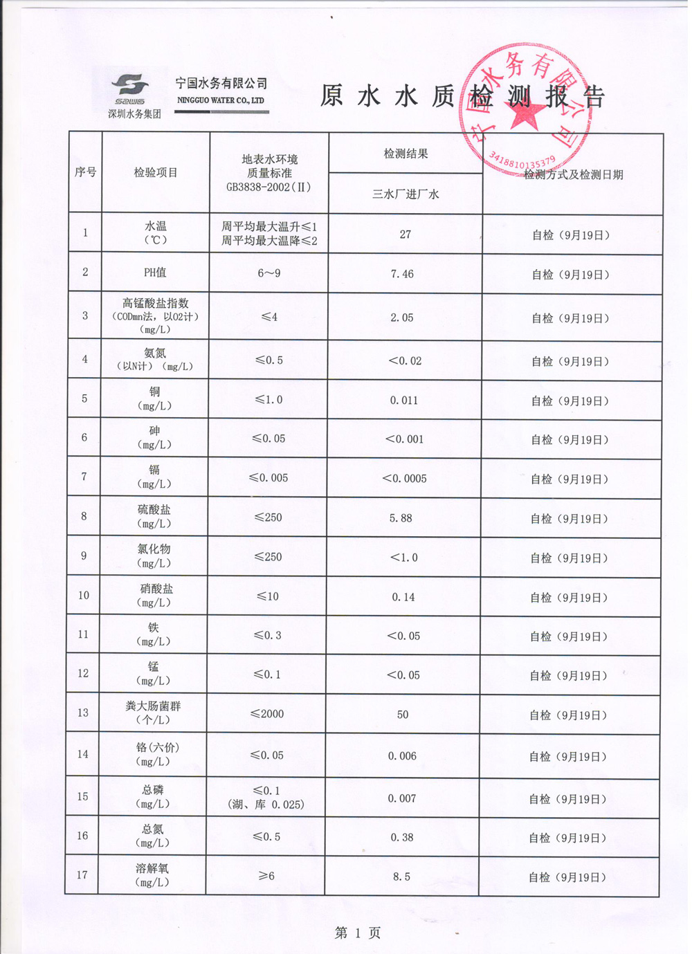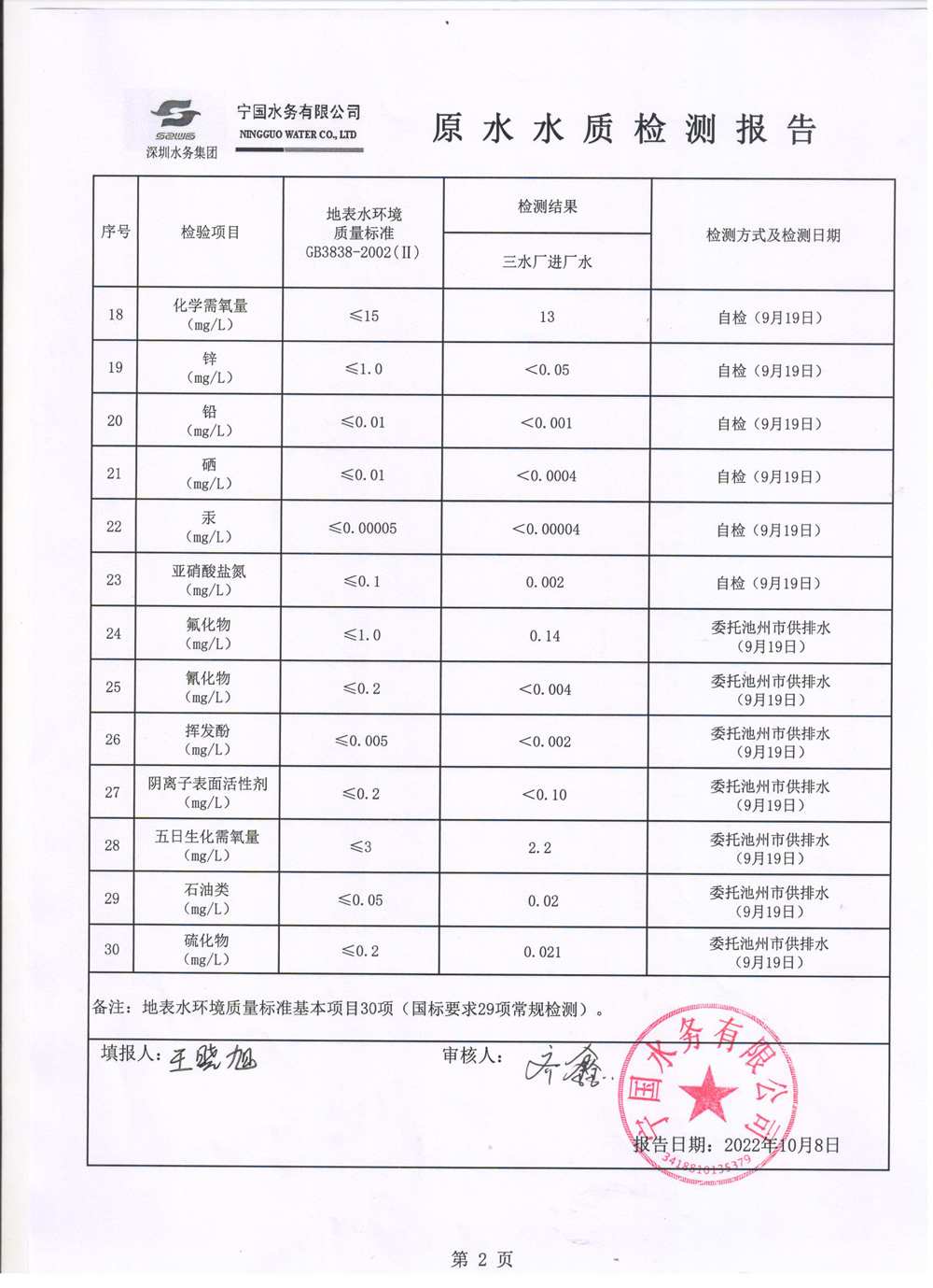 2022年9月份水質(zhì)報(bào)告
